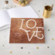 Modern chic simple typographic LOVE design and couple's names on copper colour painted abstract background, great for modern wedding and anniversary parties.