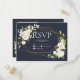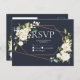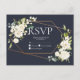 Modern and trendy, this wedding invitation RSVP design features a faux copper geometric embellished with watercolor white floral and eucalyptus greenery floral arrangements, over a modern navy blue texture. This is the no meal option. Part of a matching wedding set. Copyright Elegant Invites. All rights reserved.