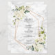Modern and trendy, this wedding menu features a faux copper geometric embellished with watercolor white floral and eucalyptus greenery floral arrangements, over a faux white marble texture. Copyright Elegant Invites. All rights reserved.