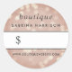 Chic round stickers with a copper rose gold bokeh background display three lines of custom text (shown with your boutique name and website) and a black field for hand writing prices. If bulk ordering stickers for certain price points, use the Customise function to add your pre-printed price.