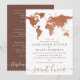 A unique world map invitation in copper and sepia brown rust tones with an editable heart location and destination wording at the bottom, perfect for a wedding abroad or local at-home reception. —Click CUSTOMIZE FURTHER to make all design edits including moving the heart or adjusting spacing of the travel information on the back. — All text on the back can be removed if you don't need to send detailed guest travel details.