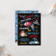 Super cute Cops and Robbers birthday party invitation with fun funky fonts. Features a police man hanging like a superhero from a helicopter, holding a doughnut, a robber or escaped inmate with a bag of cash, handcuffs, megaphone and police car.