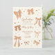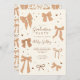 Coquette beige bow theme graduation party invitation card featuring illustration of ribbons and hearts.