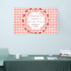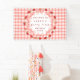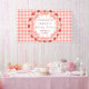 This indoor/outdoor party banner is designed for a first birthday celebration with a "Berry First" theme. The design features a repeat pattern of hand-painted watercolor red strawberries and light pink coquette bows. The background consists of a classic red and white gingham (checkered) print.