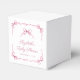 Cute party favour boxes for your baby girl shower featuring soft pink watercolors of delicate ribbons and coquette bows, blending a minimal aesthetic with a touch of vintage charm. The words "With Love & Thanks," "Baby Shower" and the name of the mother-to-be are showcased in an elegant pink script.