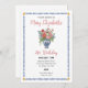 This birthday invite features a watercolor portrait of a chinoiserie style vase filled with flowers.