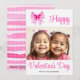 Coquette pink bow with hearts and stripes Valentine's Day photo Holiday Card. This card features a family photo and a pink coquette bow with magenta hearts on the upper left corner. The cheerful phrase "Happy Valentine's Day" is in script typography. The back reveals an appealing pattern of irregular pink, magenta and white stripes and scattered hearts.