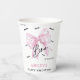 Sweet girls Halloween baby shower paper cups featuring a large pink with a white ghost pattern bow and some black bats. This coquette style girl baby shower paper cups also features a modern calligraphy heading and is ideal for a Halloween girl's baby shower.
