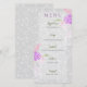 This lovely romantic menu has a sheer vellum-like layer over lovely romantic hand painted soft grey rose garden lace and bouquet with a sheer pink chic Coquette bow.