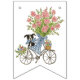 These bunting flags feature a watercolor portrait of a cute little puppy sitting on a bike with a large bouquet of pink flowers and blue and white bows.