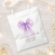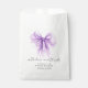 Elegant bridal shower favor bags featuring a purple coquette bow watercolor, "with love and thanks" in a chic calligraphy script, and the bride's name and shower date in simple modern lettering.