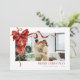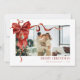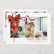 Wish your family and friends a Merry Christmas with a personalised DIY Christmas red bow photo Christmas card showcasing your family on the front wrapped up like a Christmas present in a red bow, and a back side with 3 family pictures and an editable note in a horizontal orientation.
