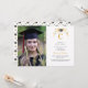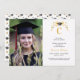 This graduation party announcent design style could be described as grandmillennial or coquette. It features a watercolor crest with a yellow ribbon with a graduation cap on top. You can personalise with an initial and a photo. The back has a coordinating pattern.