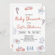 Celebrate the holiday season in style with this rustic yet playful Christmas Baby Shower invitation. Featuring a charming red and blue colour palette, this design includes festive illustrations such as a vintage red truck, Christmas trees, candy cane, gingerbread man, snowman, and wrapped present. Hand-drawn accents and modern calligraphy fonts create a cheerful balance of cosy and fun, perfect for holiday gatherings with friends, family, or coworkers. Personalise with your party details for a custom touch and spread Christmas cheer with an invitation that stands out.