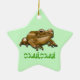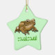 An original drawing of the coquí tree frog from Puerto Rico. Shades of brown of this distinctive tree frog and the words coquí, coquí written in green under the drawing.