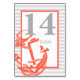 Printed table number card with grey and coral anchor design to compliment our wedding invitation set, can be personalised and ordered individually.