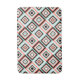 Bath mat with a bold modern pattern made up of many sizes of diamond shapes in coral orange, mint green, black, and white.