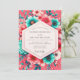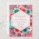 Vibrant coral and teal blossoms create a lively, artistic backdrop. This design exudes a playful yet elegant mood, perfect for a romantic event.