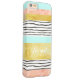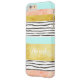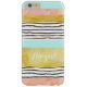 Customisable name i phone 6 case in modern colour block stripes pattern with dark grey wavy watercolor lines pattern, glamourous gold effect, peach coral pink watercolor effect, light aqua sky blue and white. Contact us for a custom colour.
