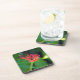 The coral bush is in the jatropha family. It's a very pretty, tropical plant. The original photograph by MaeFlowers on this Coaster is a closeup of a coral bush, sometimes called a coral palm. We see a beautiful deep pink bloom up close, with tiny yellow flowers starting to emerge. We see the bush's long, thin green leaves behind, and more natural greens in soft focus in the background of the photo.