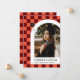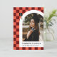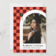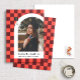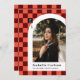 This modern and unique graduation announcement features a coral and dark red chequered background highlighting a photograph of the graduate framed in a white arch with the graduate's name and school beneath. A small gradation cap is cleverly displayed in the checked background with the graduate's graduation year. The back has a fun matching checked pattern in salmon pink and maroon.