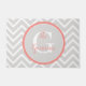 Add a welcome feeling to your front door with a Coral Chevron Monogram Doormat. Doormat design features a light grey chevron pattern with a circle emblem outlined in coral. Additional items available with this design as well. Please contact me directly for assistance with personalisation.