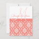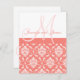 Elegant Monogram, Names Coral Damask RSVP Cards to match the 5 x 7 inch Wedding Invitation design in our store . RSVP Card Monogram and Names Layout and Design by Elke Clarke © 2008, 2009, 2010. Damask Pattern Licensed.com and WhiteWhimsicalWeddings.blogspot.com. Customise with your monogram names and wedding colours. Add all your wedding RSVP information on the back of the card using Zazzle's easy to use menu prompts.