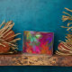 Brilliant orange, pink, blue, green, purple, yellow, and turquoise fractal patterns like a riot of coral, with decorative gold framing containing a single smooth gem.