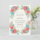 A delicate watercolor design features coral roses intertwined with soft blue blossoms and lush green leaves. The airy, painterly style evokes a romantic and whimsical atmosphere, perfect for a spring or summer occasion.