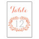 Coral foliage wreath frame wedding table number place cards featuring a coral orange frame made of leaves and text in grey on ivory. This modern stylish and elegant template is a totally customisable design part of a wedding set perfect for your spring, summer and fall or autumn wedding.