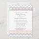 Personalised baby shower invitations in elegant and modern peach orange pink, light grey and white fun chevron zigzags pattern. Customisable with your text, contact us to request a colour change.