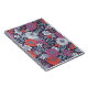 This notebook features zinnias surrounded by other flowers and leaves in shades of coral, white, magenta, and blue on a navy blue background.