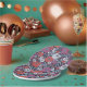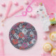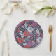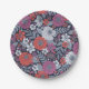 These paper plates feature zinnias surrounded by other flowers and leaves in shades of coral, white, magenta, and blue on a navy blue background.