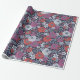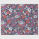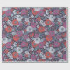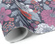 This gift wrap has zinnias surrounded by other flowers and leaves in shades of coral, white, magenta, and blue on a navy blue background.