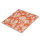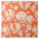Ceramic tile in a pattern of pastel orange and creamy white semi-abstract sea shells on a deep coral orange background