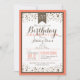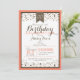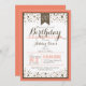 Personalise this formal, elegant, coral orange, white, taupe brown, tan confetti adult or teen Modern birthday party invitation. Perfect year round for spring, summer, fall, or winter birthday parties. Neutral trendy design for man or woman, boy or girl. Stylish, classy invite for any adult or teen milestone birthday including Sweet 16, 18th, 21st, 30th, 40th, 50th, 60th, 70th, 75th, 80th, 85th, 90th, 95, 100th birthday.