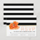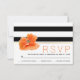 This gorgeous floral wedding RSVP response card showcases a lovely poppy flower and a black and white striped pattern. Your text is on a white band with a gold stripe.