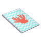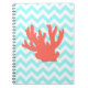 A coral-orange silhouette of sea coral is on a background of white and sky blue zigzags.
