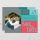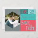 Coral and Teal go together beautifully. This Save the Date card is designed with bold colours and geometric shapes. The front of the card features grey, coral, and three shades of teal. Your favourite engagement photo is framed in the shape of a hexagon. Large text is also featured on the front that is customisable. The back of the card simply displays a QR code, also customisable with your wedding website.