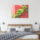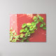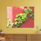 A green vine crawls around a coral coloured wall and corner. The contrast between colours is stimulating. Water beads can be seen on some of the leaves.