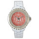 This beautiful wristwatch is perfect for adding a touch of elegance to your wardrobe. It's done in a soft coral colour with a white garland of flowers and dots in a stencil look, with white numbers to match. Add your monogram letter to personalise. You can also customise the coral colour to whatever you'd like! See matching items in our store.