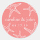 Coastal chic stickers for your wedding invitations or favours feature your names and wedding date in white lettering on a vibrant coral background, flanked by vintage style starfish illustrations.