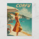 This elegant vintage poster captures the sunny charm of Corfu with a stylish 1950s woman standing at the beach. Dressed in a classic summer dress and gazing over the sparkling Ionian Sea, she embodies the timeless glamour of mid-century Mediterranean holidays. With soft retro colours and nostalgic textures, this artwork is perfect for vintage travel lovers and beach decor enthusiasts.