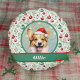 This design features charming artwork of a Welsh corgi, which has a watercolor look. It's set against a sparkly sage green and sparkle lights background, and then bordered in a darker green with a red and green Christmas ornament pattern. Your or your recipient's dog's name appears in white on a green and red banner. Make sure to type the dog's name you want in the Personalise section.