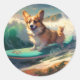 Corgi Beach Surfing Painting Classic Round Sticker