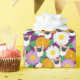 Add a cute touch to gifts with this wrapping paper that features close-up style illustrations of a corgi dogs flowers and vibrant flower graphics in white, yellow, green, orange and lavender against a purple background.
