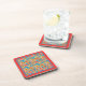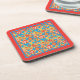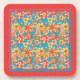 A set of 6 cork-back coasters with a cheerful all-over pattern of red, orange and yellow flowers on a bright turquoise background, and a bright orange border, from a handpainted paper collage by Judy Adamson.
