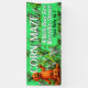 Big fabric sign for advertising a corn maze. A fun autumn activity for the family is to visit a local farm and follow the maze through dead corn stalks. This sign size is 2.5 x 6 feet and is an eye-catching lime green colour. An orange pumpkin man stands among more jack o'lanterns at the left side. Stalks of corn are the backdrop for bold white and black text. Include the name of the farm and location along with the hours of operation. Other sign sizes may work. It will print as you see it, and don't let any wording get near the edge.