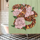 A corn snake is coiled uo with three pink flowers in a backdrop of light green