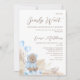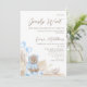 Boy's we can bearly wait for baby to arrive baby shower invitation featuring a modern calligraphy heading, a boho watercolor floral arrangement with blue roses and pampas grass, a cute bear wearing a blue coat and heart shaped balloons. Great for an upcoming boy's baby shower.